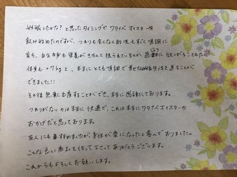 妊娠したかな?と思ったタイミングでワタナベオイスターを飲み始めたのですが、つわりも全くなく胎児もすごく順調に育ち、自分自身も栄養がき7ちんと摂られているのか過剰に欲しがることもなく体重もプラス7kgと、本当にとても順調で幸せな妊娠生活を送ることができました!!